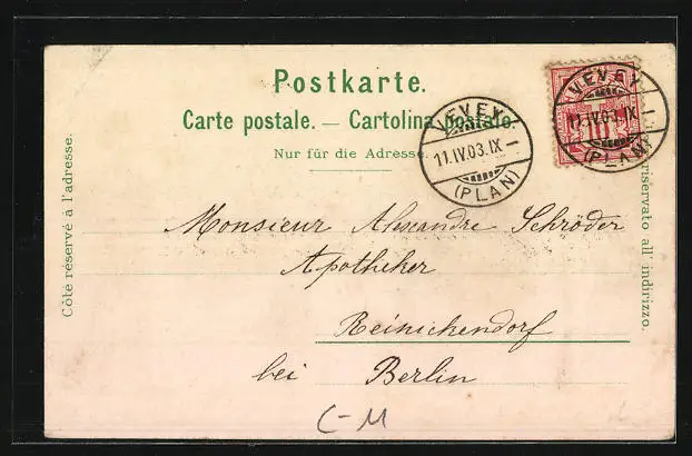 Personenbezogene Daten auf der Rückseite der Karte wurden durch blauen Textmarker unkenntlich gemacht. Die blauen Stellen sind auf die Vorderseite durchgeweicht und wirken sich negativ auf das Postkartenfoto aus