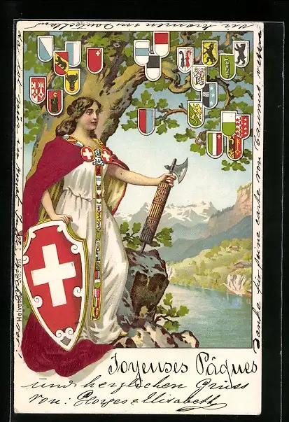 Lithographie Schweiz, Helvetia mit Schweizer Wappen