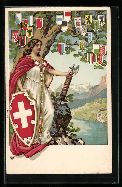 Lithographie Schweiz, Helvetia mit Wappenschild, Baum mit Kantons-Wappen