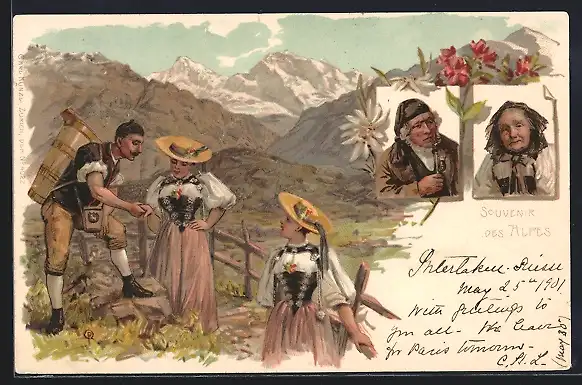 Lithographie Schweiz, Mädchen in Tracht in den Bergen