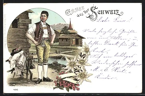 Lithographie Schweizer Mann in Tracht