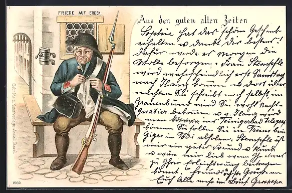 Lithographie Schweizer Soldat sitzt auf einer Bank