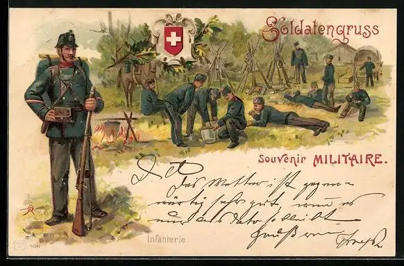 Lithographie Schweizer Soldaten in Uniformen im Lager, Soldatengruss