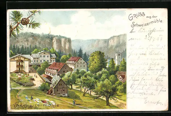 Lithographie Schweizermühle, Gesamtansicht des Ortes