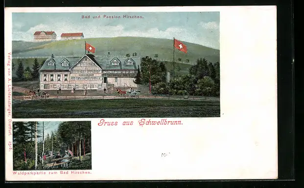 Lithographie Schwellbrunn, Waldparkpartie mit Bad und Pension Hirschen