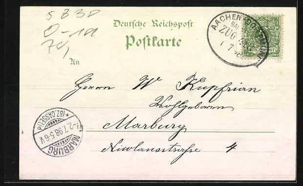 Personenbezogene Daten auf der Rückseite der Karte wurden durch blauen Textmarker unkenntlich gemacht. Die blauen Stellen sind auf die Vorderseite durchgeweicht und wirken sich negativ auf das Postkartenfoto aus