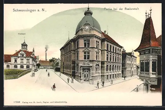 Lithographie Schwenningen a. N., Postamt mit Realanstalt