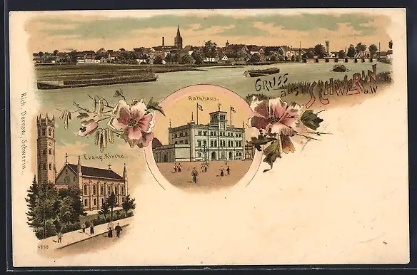 Lithographie Schwerin a. W., Rathaus, Evang. Kirche und Panorama