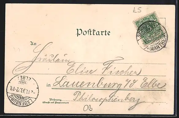 Personenbezogene Daten auf der Rückseite der Karte wurden durch blauen Textmarker unkenntlich gemacht. Die blauen Stellen sind auf die Vorderseite durchgeweicht und wirken sich negativ auf das Postkartenfoto aus