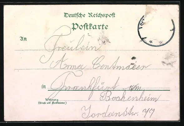 Personenbezogene Daten auf der Rückseite der Karte wurden durch blauen Textmarker unkenntlich gemacht. Die blauen Stellen sind auf die Vorderseite durchgeweicht und wirken sich negativ auf das Postkartenfoto aus
