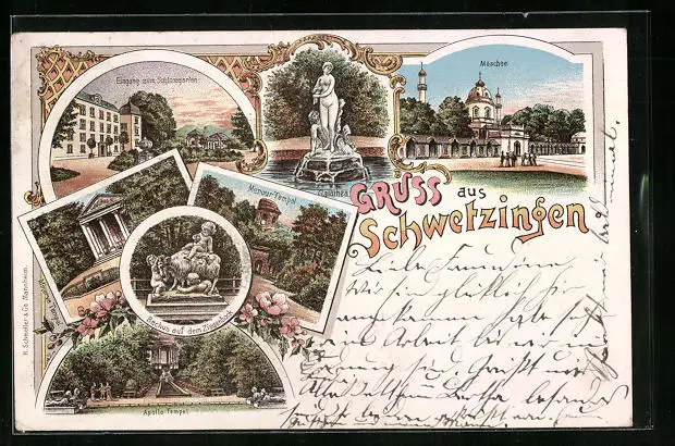 Lithographie Schwetzingen, Moschee, Apollo-Tempel, Mercur-Tempel