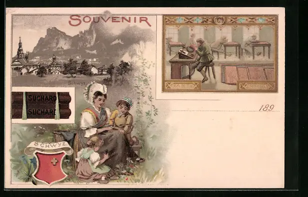 Lithographie Schwyz, Chocolat Suchard, Ortspartie, Mutter mit Kindern