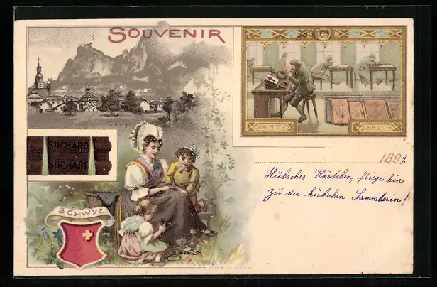 Lithographie Schwyz, Chocolat Suchard, Ortspartie, Mutter mit Kindern