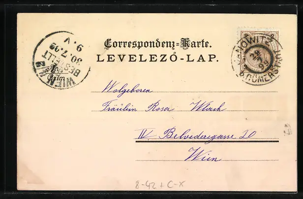 Personenbezogene Daten auf der Rückseite der Karte wurden durch blauen Textmarker unkenntlich gemacht. Die blauen Stellen sind auf die Vorderseite durchgeweicht und wirken sich negativ auf das Postkartenfoto aus