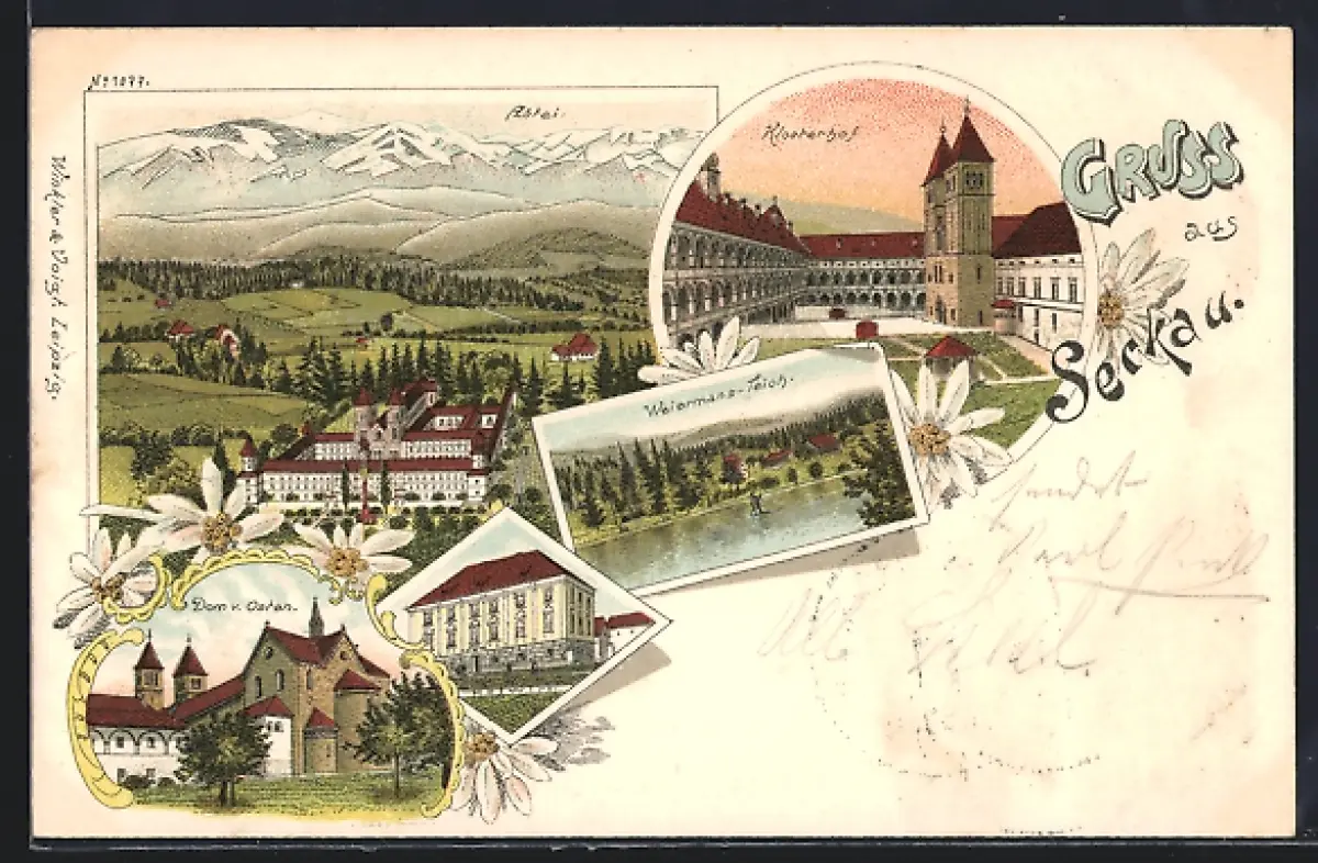 Lithographie Seckau, Klosterhof, Dom von Osten, Blick auf die Abttei
