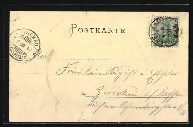 Personenbezogene Daten auf der Rückseite der Karte wurden durch blauen Textmarker unkenntlich gemacht. Die blauen Stellen sind auf die Vorderseite durchgeweicht und wirken sich negativ auf das Postkartenfoto aus