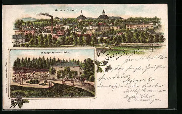 Lithographie Seebergen b. Gotha, Restaurant v. Hermann Sebig, Totalansicht