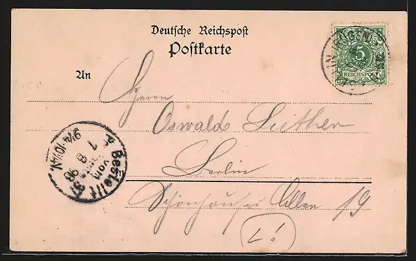 Personenbezogene Daten auf der Rückseite der Karte wurden durch blauen Textmarker unkenntlich gemacht. Die blauen Stellen sind auf die Vorderseite durchgeweicht und wirken sich negativ auf das Postkartenfoto aus