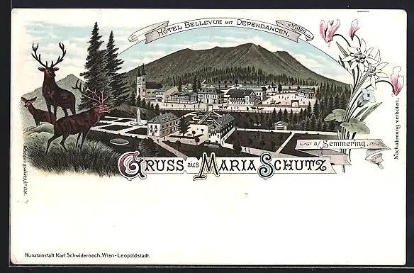 Lithographie Semmering, Maria-Schutz, Hotel Bellevue mit Dependancen, Villen, Hirsche
