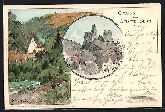 Lithographie Senftenberg a. d. / Krems, Ortspartie, Ruine