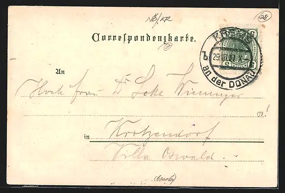 Personenbezogene Daten auf der Rückseite der Karte wurden durch blauen Textmarker unkenntlich gemacht. Die blauen Stellen sind auf die Vorderseite durchgeweicht und wirken sich negativ auf das Postkartenfoto aus