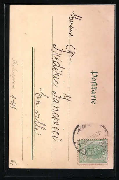 Personenbezogene Daten auf der Rückseite der Karte wurden durch blauen Textmarker unkenntlich gemacht. Die blauen Stellen sind auf die Vorderseite durchgeweicht und wirken sich negativ auf das Postkartenfoto aus