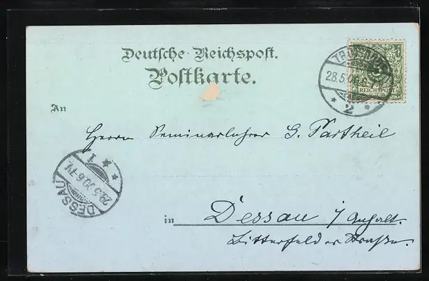 Personenbezogene Daten auf der Rückseite der Karte wurden durch blauen Textmarker unkenntlich gemacht. Die blauen Stellen sind auf die Vorderseite durchgeweicht und wirken sich negativ auf das Postkartenfoto aus