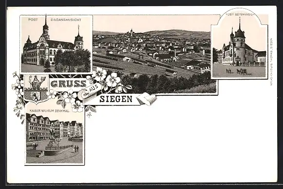 Lithographie Siegen, Post, Kaiser Wilhelm-Denkmal, Ortspanorama
