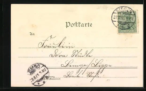Personenbezogene Daten auf der Rückseite der Karte wurden durch blauen Textmarker unkenntlich gemacht. Die blauen Stellen sind auf die Vorderseite durchgeweicht und wirken sich negativ auf das Postkartenfoto aus