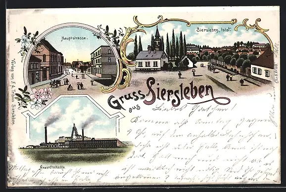 Lithographie Siersleben, Hauptstrasse, Niewandtschächte, Totalansicht