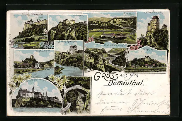 Lithographie Sigmaringen i. Donauthal, Ortsansicht mit Schloss und Beuron