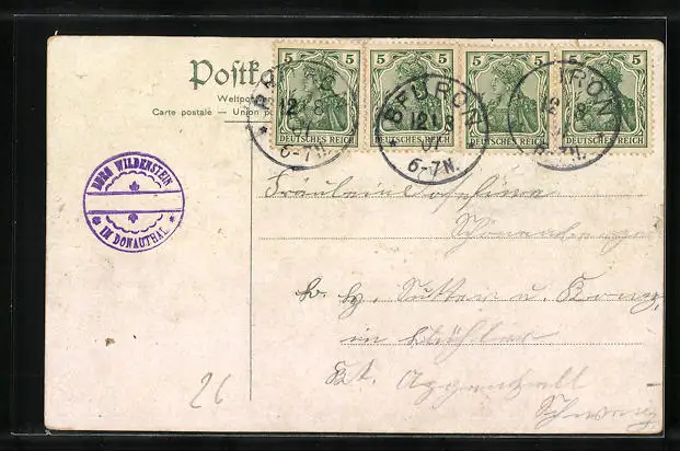 Personenbezogene Daten auf der Rückseite der Karte wurden durch blauen Textmarker unkenntlich gemacht. Die blauen Stellen sind auf die Vorderseite durchgeweicht und wirken sich negativ auf das Postkartenfoto aus