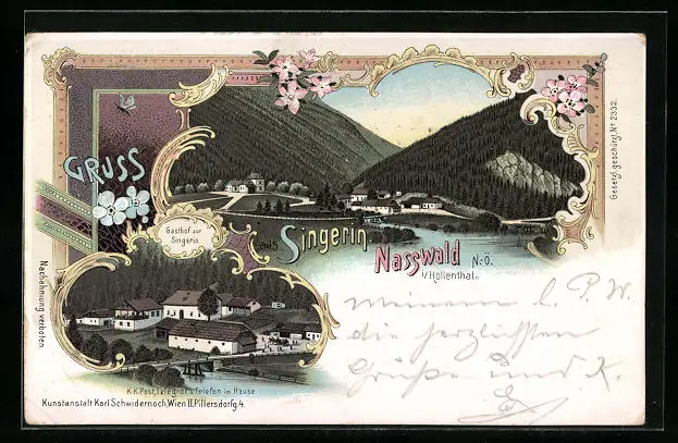 Lithographie Singerin-Nasswald, Gasthof zur Singerin, Teilansicht