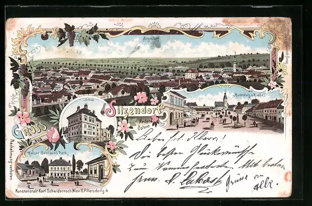 Lithographie Sitzendorf, Totalansicht, Schule, Marienplatz und Kirche