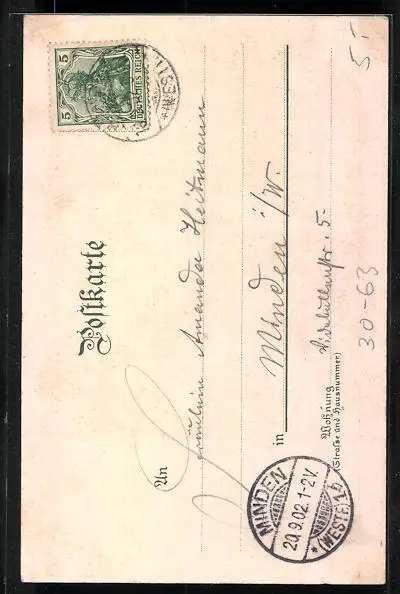 Personenbezogene Daten auf der Rückseite der Karte wurden durch blauen Textmarker unkenntlich gemacht. Die blauen Stellen sind auf die Vorderseite durchgeweicht und wirken sich negativ auf das Postkartenfoto aus