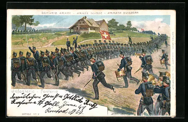 Lithographie Soldaten stürmen auf zum Kampf, schweizer Armee