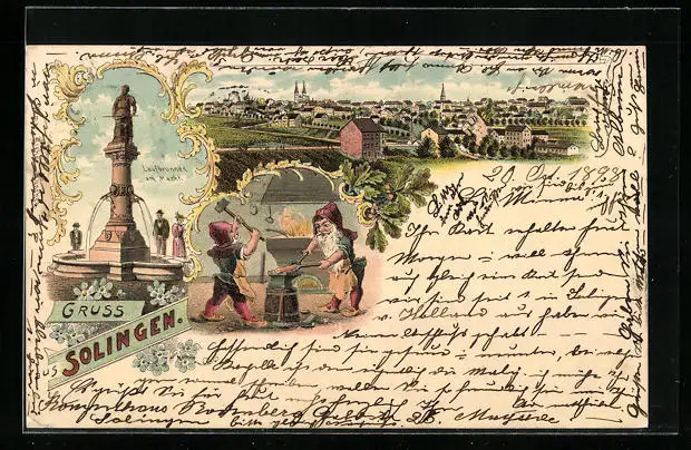 Lithographie Solingen, Laufbrunnen, Schmiedende Zwerge, Ortsansicht