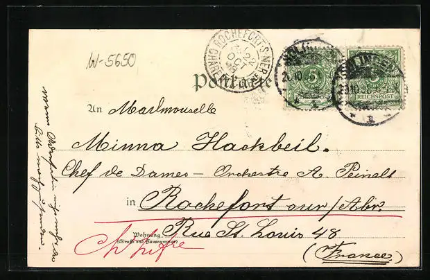 Personenbezogene Daten auf der Rückseite der Karte wurden durch blauen Textmarker unkenntlich gemacht. Die blauen Stellen sind auf die Vorderseite durchgeweicht und wirken sich negativ auf das Postkartenfoto aus