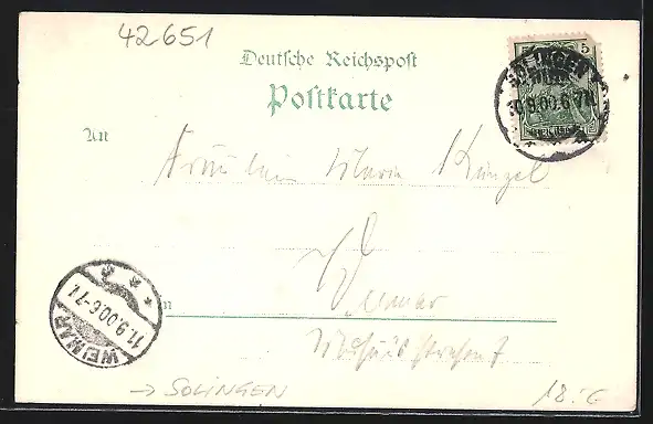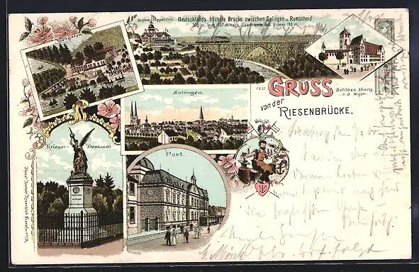 Lithographie Solingen, Ortsansicht mit Post und Krieger-Denkmal