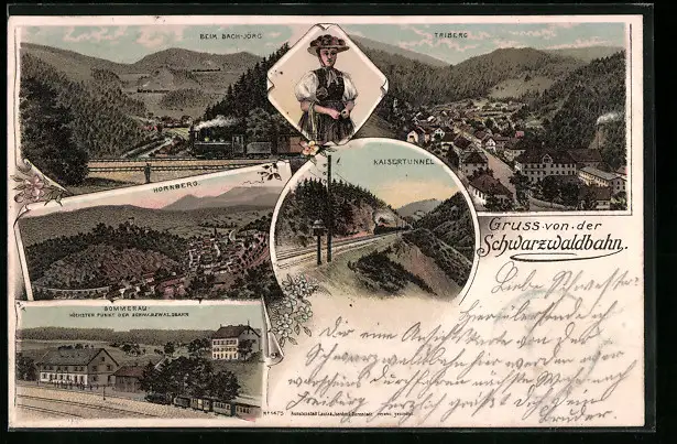 Lithographie Sommerau, Bahnhof, Kaisertunnel, Hornberg