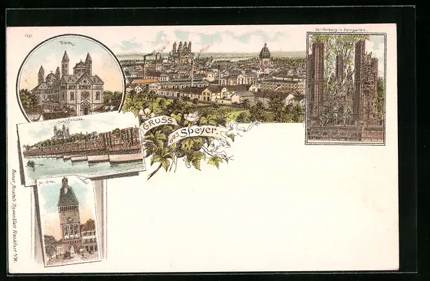 Lithographie Speyer, Dom, Schiffbrücke, Altpörtel