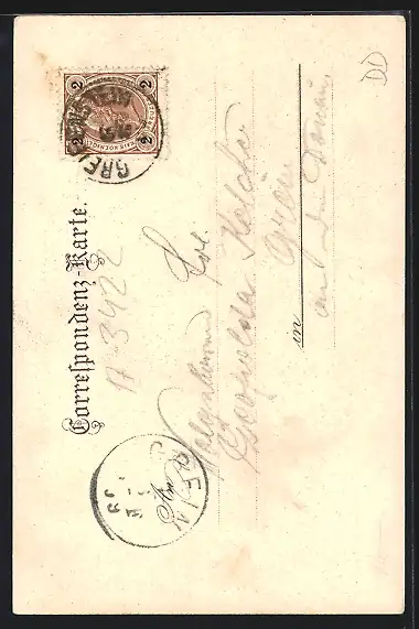 Personenbezogene Daten auf der Rückseite der Karte wurden durch blauen Textmarker unkenntlich gemacht. Die blauen Stellen sind auf die Vorderseite durchgeweicht und wirken sich negativ auf das Postkartenfoto aus