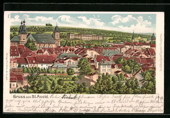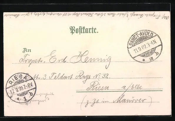 Personenbezogene Daten auf der Rückseite der Karte wurden durch blauen Textmarker unkenntlich gemacht. Die blauen Stellen sind auf die Vorderseite durchgeweicht und wirken sich negativ auf das Postkartenfoto aus