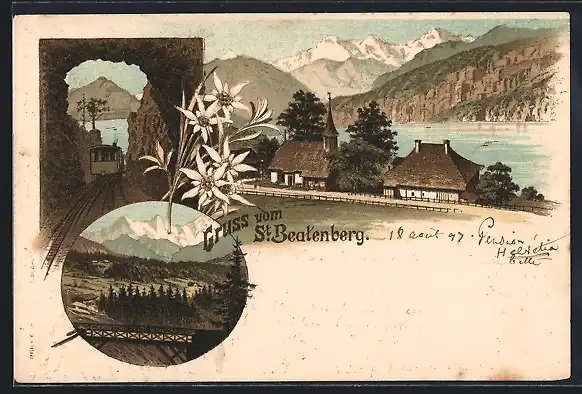 Lithographie St. Beatenberg, Ansicht der Ortschaft, Eisenbahnbrücke und St. Beatenberg