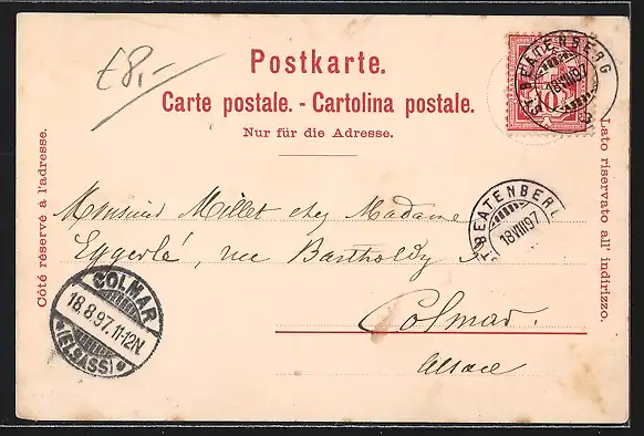 Personenbezogene Daten auf der Rückseite der Karte wurden durch blauen Textmarker unkenntlich gemacht. Die blauen Stellen sind auf die Vorderseite durchgeweicht und wirken sich negativ auf das Postkartenfoto aus