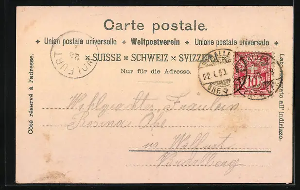 Personenbezogene Daten auf der Rückseite der Karte wurden durch blauen Textmarker unkenntlich gemacht. Die blauen Stellen sind auf die Vorderseite durchgeweicht und wirken sich negativ auf das Postkartenfoto aus
