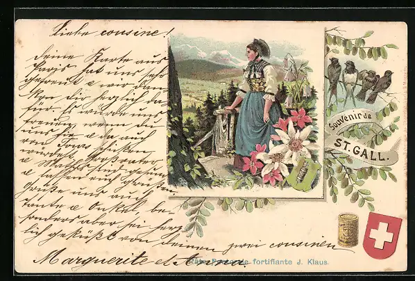 Lithographie St. Gallen, Frau in Schweizer Tracht mit Schwalben