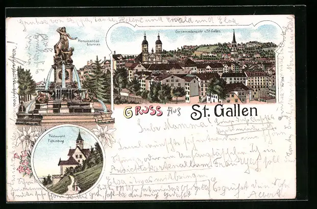 Lithographie St. Gallen, Ortsansicht, Monumentalbrunnen, Restaurant Falkenburg