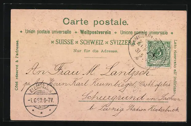 Personenbezogene Daten auf der Rückseite der Karte wurden durch blauen Textmarker unkenntlich gemacht. Die blauen Stellen sind auf die Vorderseite durchgeweicht und wirken sich negativ auf das Postkartenfoto aus