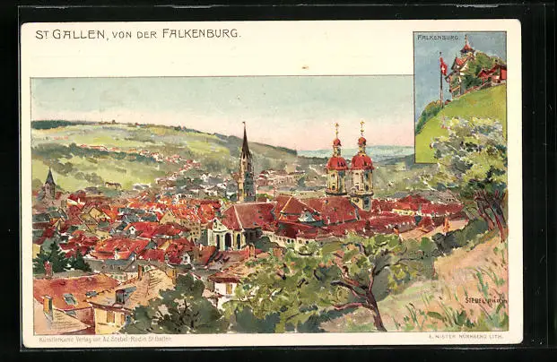 Lithographie St. Gallen, Ortsansicht von der Falkenburg
